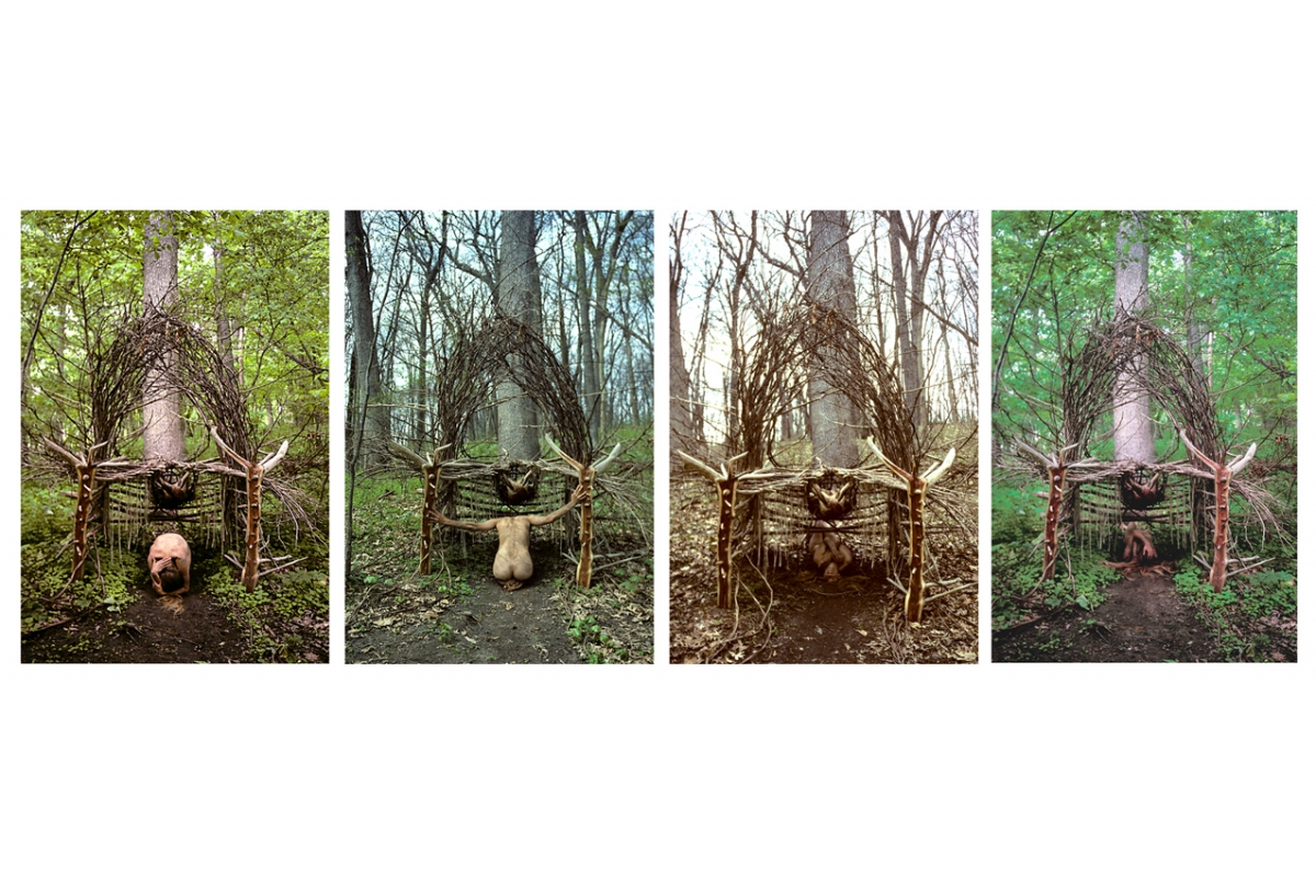 Series of performances for the still and video camera and as well as live audiences over a two year period from 1995-1997 on private property near Iowa City during graduate work in Intermedia at the University of Iowa.  Most of the works were self-portraits, working with the camera on self-timer.  Many still images were shot over the 2-year period in various formats:  35mm color slide, 35mm B&W, color and B&W medium and large format.  Video was shot in analog hi-8.